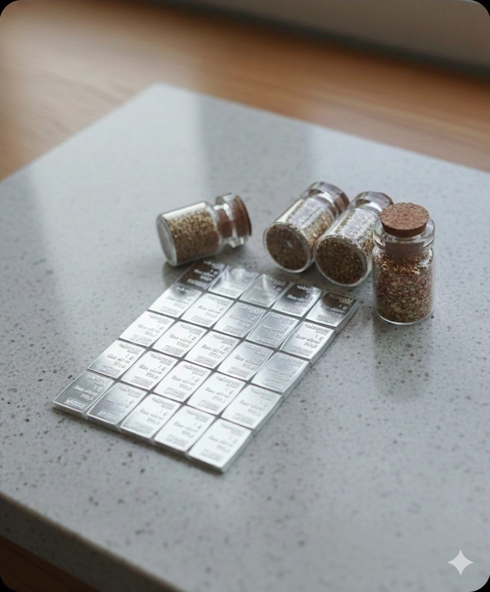 (25) 1 Gram .999 Silver VALCAMBI SUISSE Bars + 4 Jars of 24K GOLD Flakes ✨