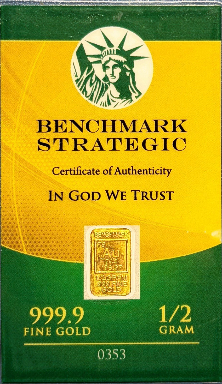 0.5g .9999 Gold Bar Benchmark Strategic USA Assay Statue of Liberty