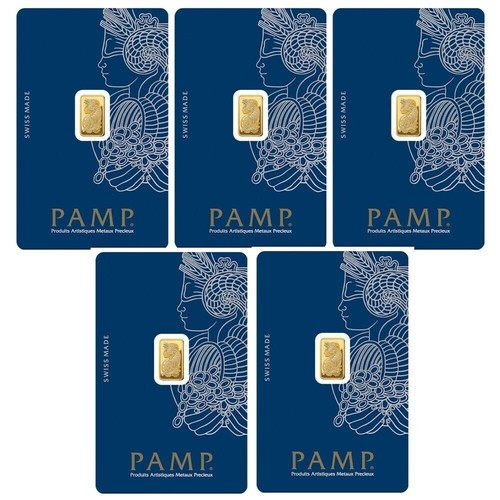 Lot of 5 – 1 gram Gold Bar PAMP Suisse Fortuna .9999 Fine Gold – In Sealed Assay