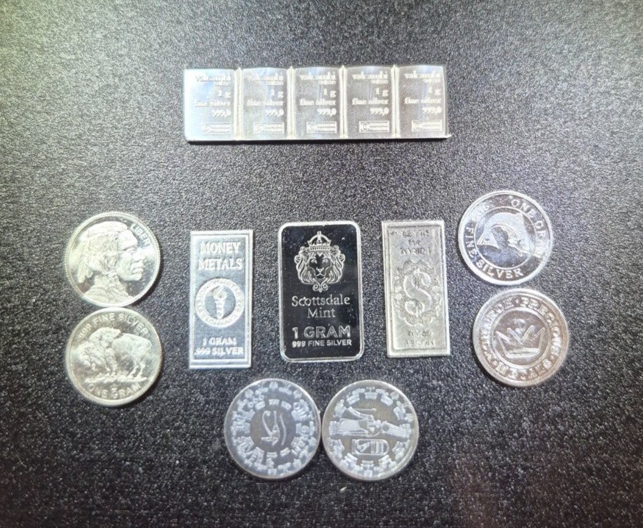Silver Bullion Lot-8 Grams of Silver Total-5g Bar & 3 different 1 Gram bar/round