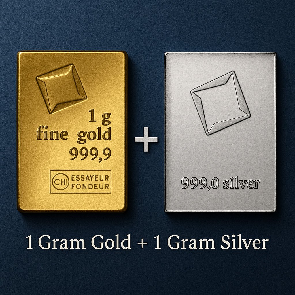 COMBO 1 gram Gold + Silver Valcambi Suisse .9999 Fine Gold & Silver Bars